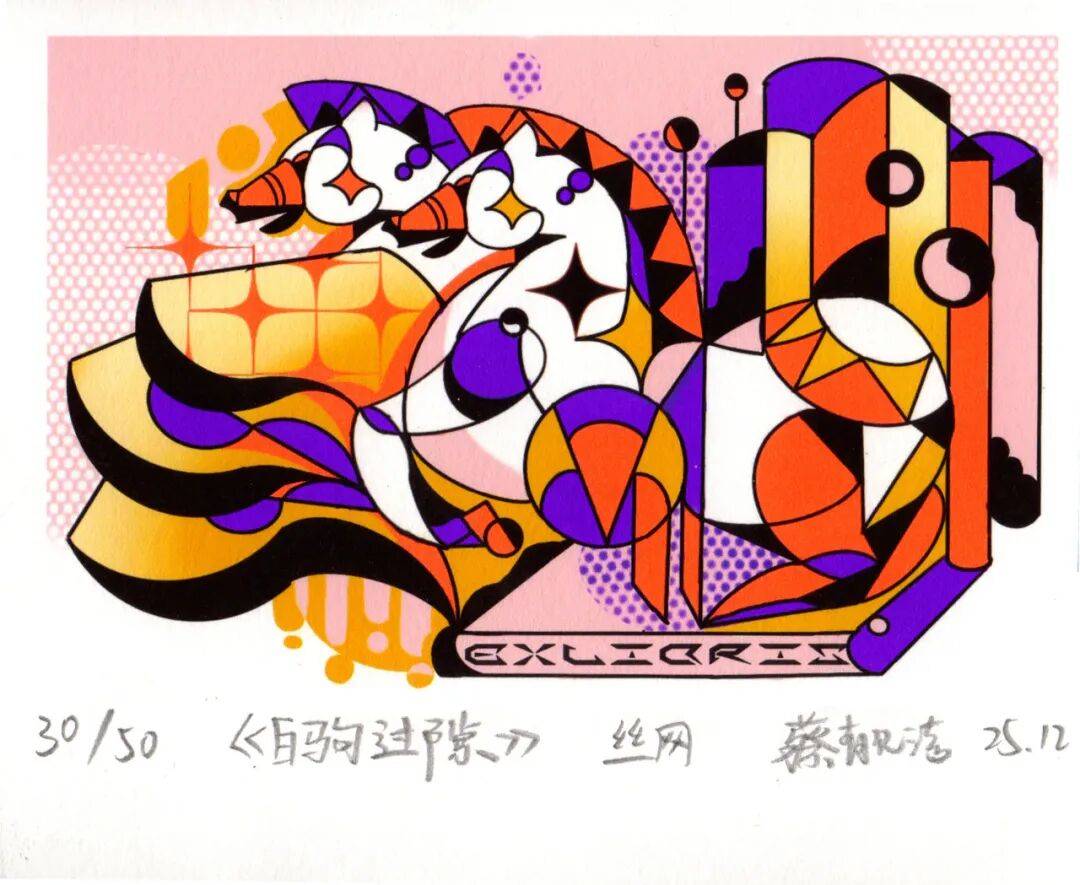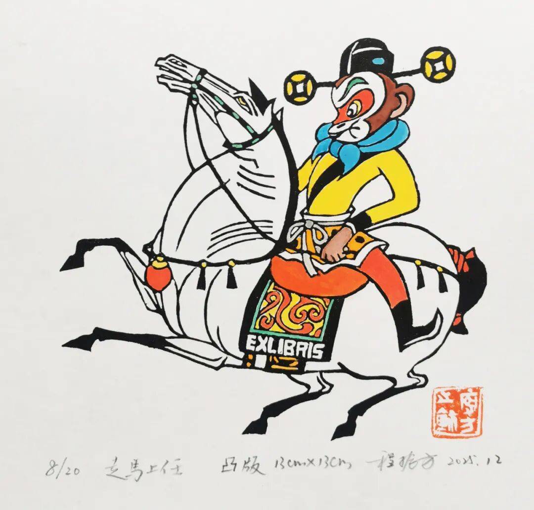 正在中国保守文化中,通过解构的几何点线面形成骏马从书中奔行的画面结果。是中国平易近间送新享福的保守风俗,头戴的古铜钱官帽,【创做感言】此藏书票援用《西纪行》里孙悟空初次被封为弼马温时骑着白马“走顿时任”春风满意的场景,既表达了对将来的积极期许,结业于广西艺术学院,融合了保守生肖文化取现代设想言语,专业进修之外,呈现出巧妙构想、充满刻痕神韵的拜年生肖版画做品,